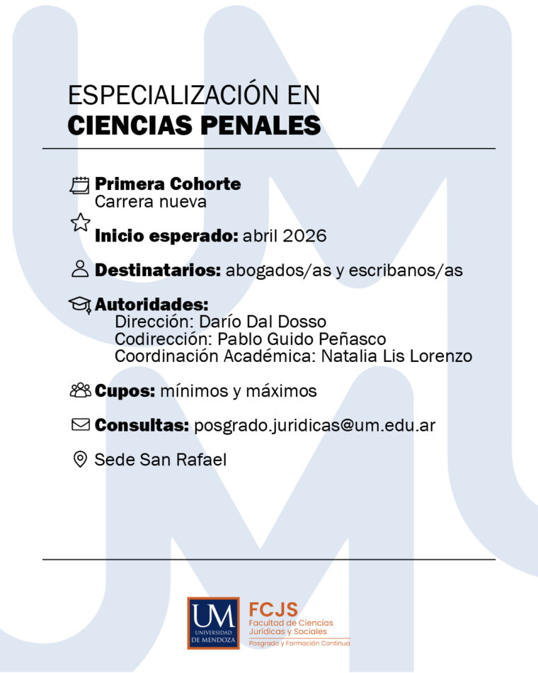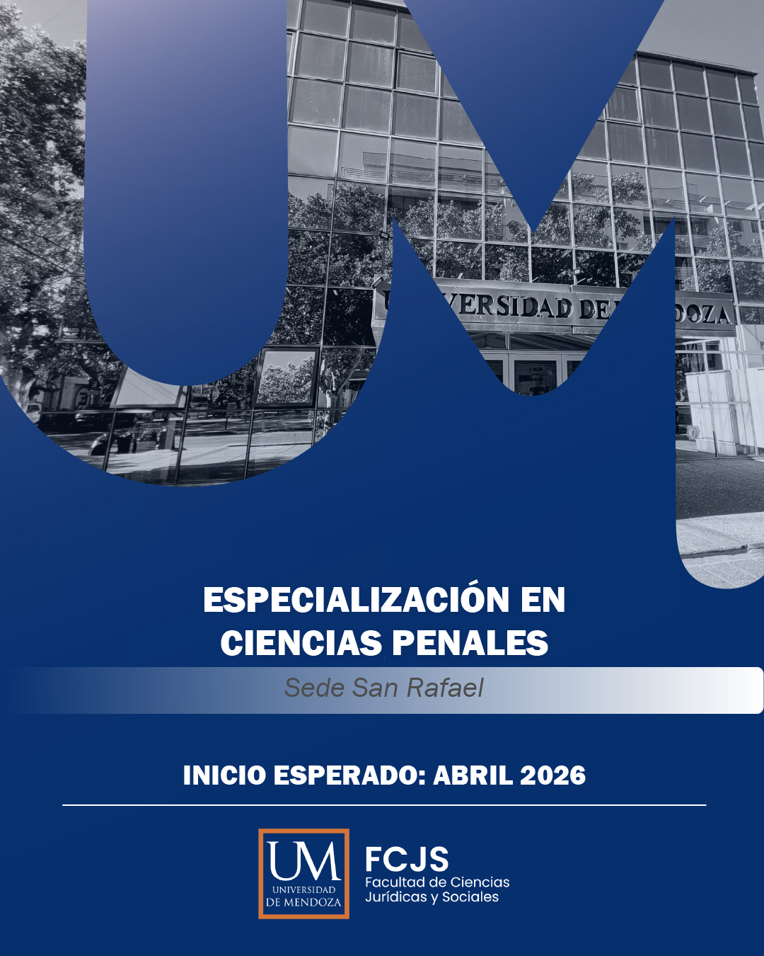 Resulta interesante destacar que la Facultad de Ciencias Jurídicas y Sociales de la Universidad de Mendoza, inició la carrera de grado en abogacía en la sede San Rafael en el año 1996; por lo que luego de 28 años deviene en necesario iniciar una Especialización en Ciencias Penales para los graduados del sur de Mendoza y del país; dado que no existe carrera de posgrado en la materia señalada.