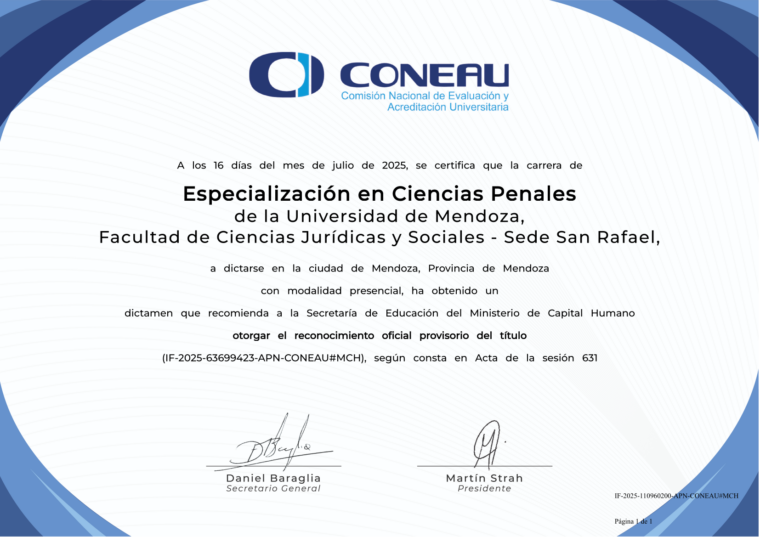 Quienes aprueben la Especialización en Ciencias Penales que se dicta en Sede San Rafael, podrán solicitar su inscripción en la Maestría en Derecho Penal que se dicta en Sede Central, y así continuar sus estudios de posgrado con un trayecto exclusivamente diseñado para quienes opten por la doble titulación.