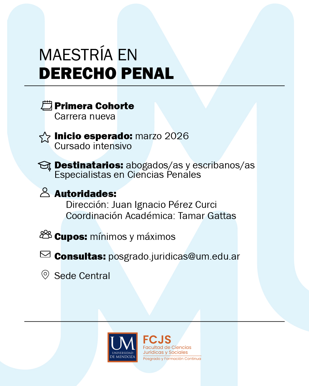 La Maestría en Derecho Penal que se presenta busca ofrecer a los profesionales del medio y a quienes realicen la Especialización en Ciencias Penales, un espacio curricular de formación integral en el ámbito señalado, de profundización del conocimiento jurídico en materia penal moderno y de investigación sobre las temáticas abordadas. El conocimiento detallado de la legislación penal vigente (de fondo y de forma), con sus diversas modificaciones; el manejo de herramientas conceptuales y teóricas avanzadas destinadas a enfrentar los problemas que se le plantean al jurista penal, teniendo presente las materias vinculadas a problemas específicos del derecho comparado e internacional, puntualmente en la temática de los derechos humanos; así como el impacto de las tecnologías en el fenómeno penal exigen a los operadores jurídicos la continuidad de estudios para cumplir sus funciones acabadamente, sea desde el ejercicio de la magistratura, de la función pública, desde la profesión, la docencia y la investigación.