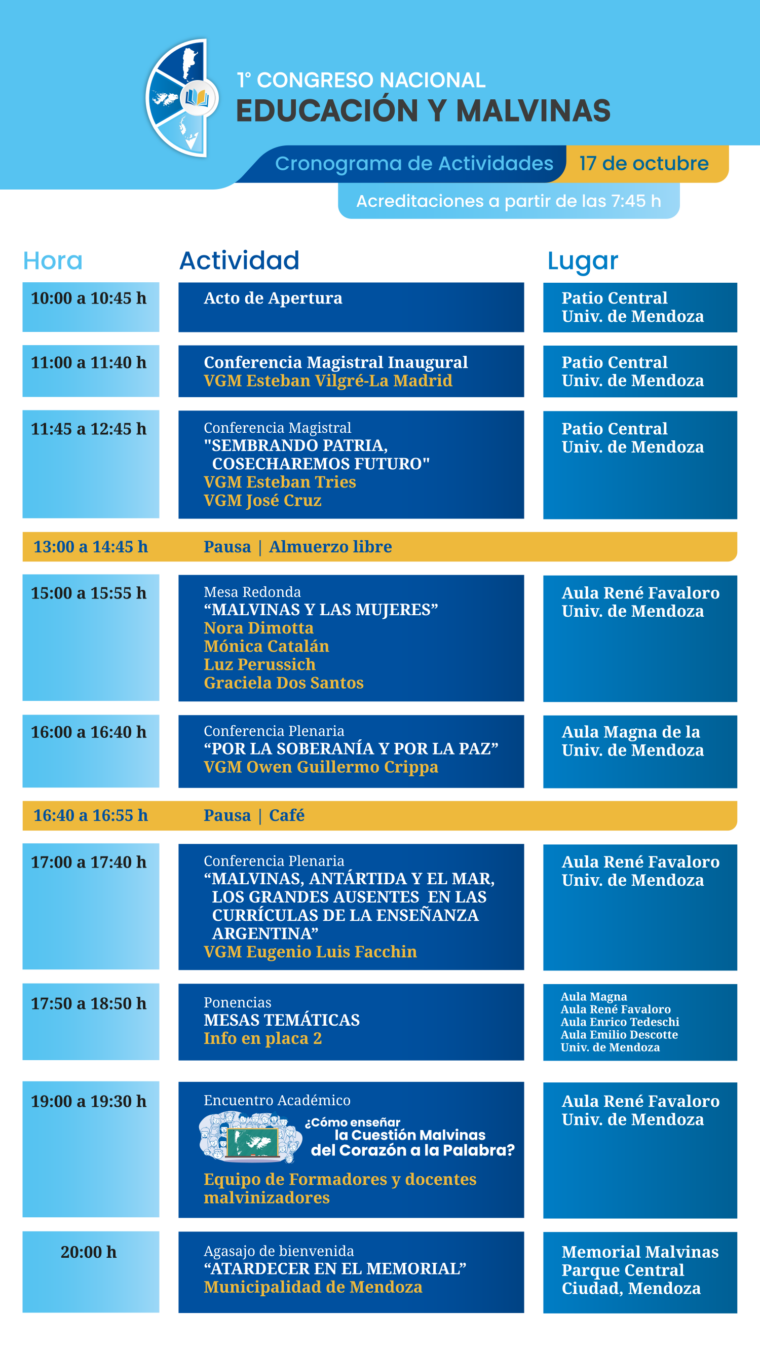 La Universidad de Mendoza -en el marco de las actividades de su Dirección de Posgrado y Formación Continua– y, con el aval y colaboración del Observatorio Interuniversitario Cuestión Malvinas de la Provincia de Mendoza, del Ministerio de Educación, Cultura, Infancias y la Dirección General de Escuelas – Educación Superior y de la Municipalidad de la Ciudad de Mendoza, anuncia la realización del Primer Congreso Nacional de Educación y Malvinas, que tendrá lugar en la ciudad de Mendoza los próximos 17 y 18 de octubre de 2025, lo que marca un hito nacional en la enseñanza de la Cuestión Malvinas.
