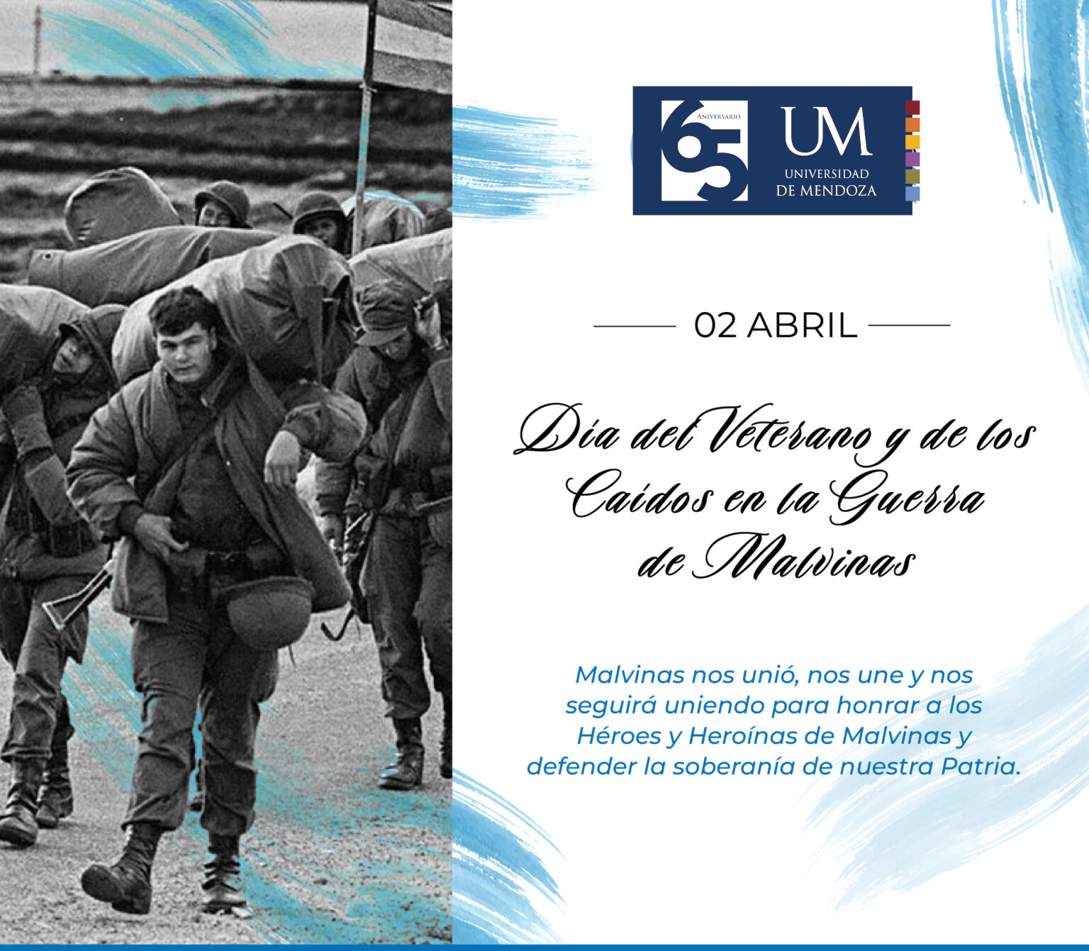 ¡Las Malvinas son, fueron y serán argentinas! Desde la Universidad de Mendoza rendimos homenaje a los veteranos y a los 649 caídos, reconociendo su valentía, entrega y sacrificio en defensa de la soberanía nacional. El 2 de abril de 1982 marcó el inicio de la Operación Rosario, y desde entonces esta fecha es un espacio de memoria colectiva, reflexión y agradecimiento.