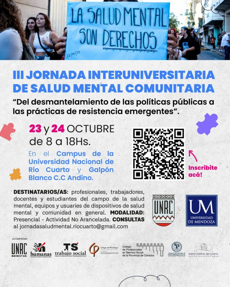 Los días 23 y 24 de octubre de 2025, de 8 a 18 horas, se llevará a cabo la 3° Jornada Interuniversitaria de Salud Mental Comunitaria bajo el lema “Del desmantelamiento de las políticas públicas a las prácticas de resistencia emergentes”.