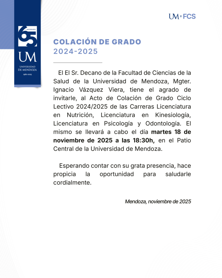 Las autoridades de la FCS invitan a la Comunidad de la Universidad de Mendoza a participar a esta ceremonia que se realizará el 18 de noviembre a las 18.30 h en el Patio Central de la UM.
