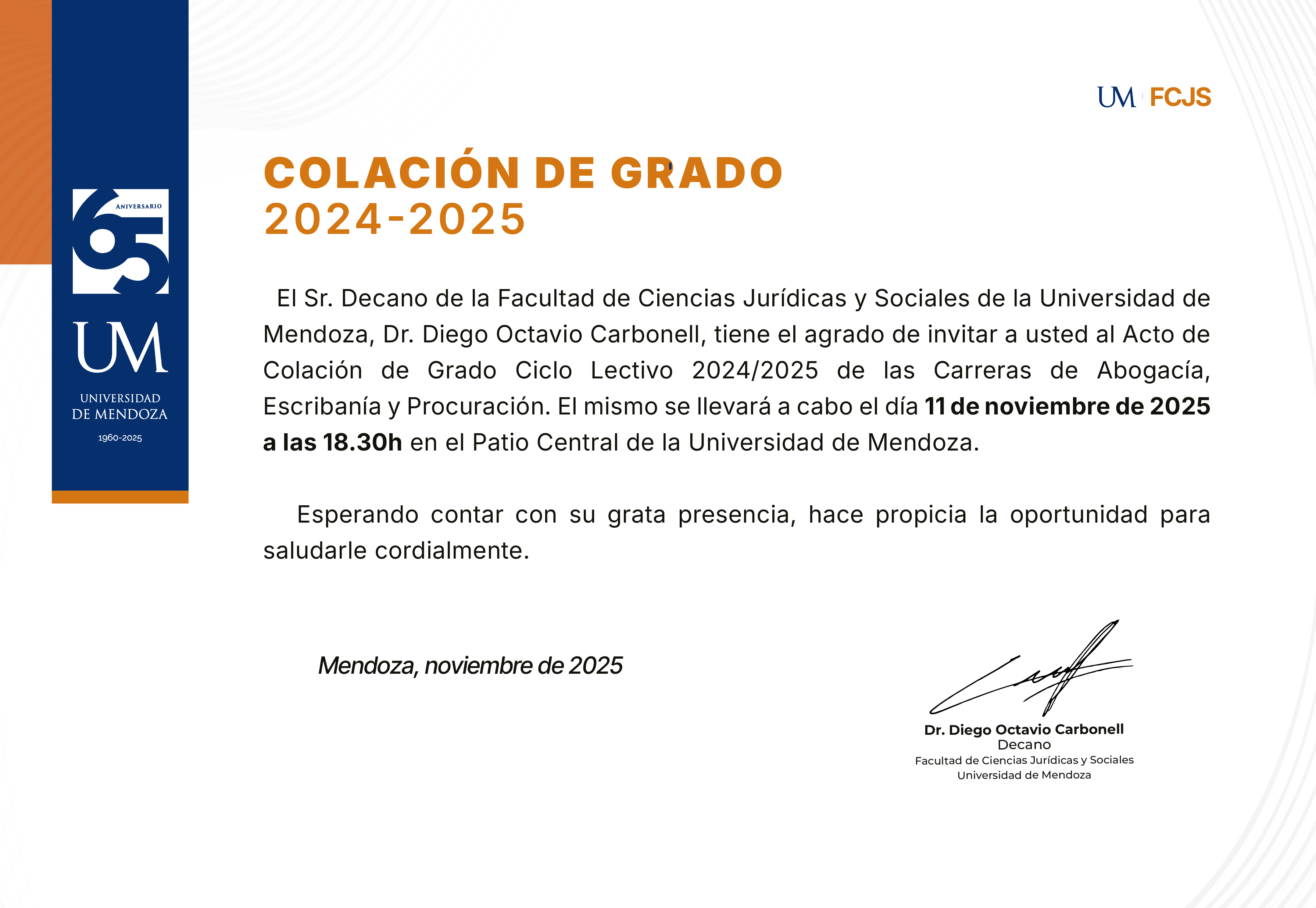 Las autoridades de la FCJS invitan a la Comunidad de la Universidad de Mendoza a participar a esta ceremonia que se realizará el 11 de noviembre a las 18.30 h en el Patio Central de la UM.