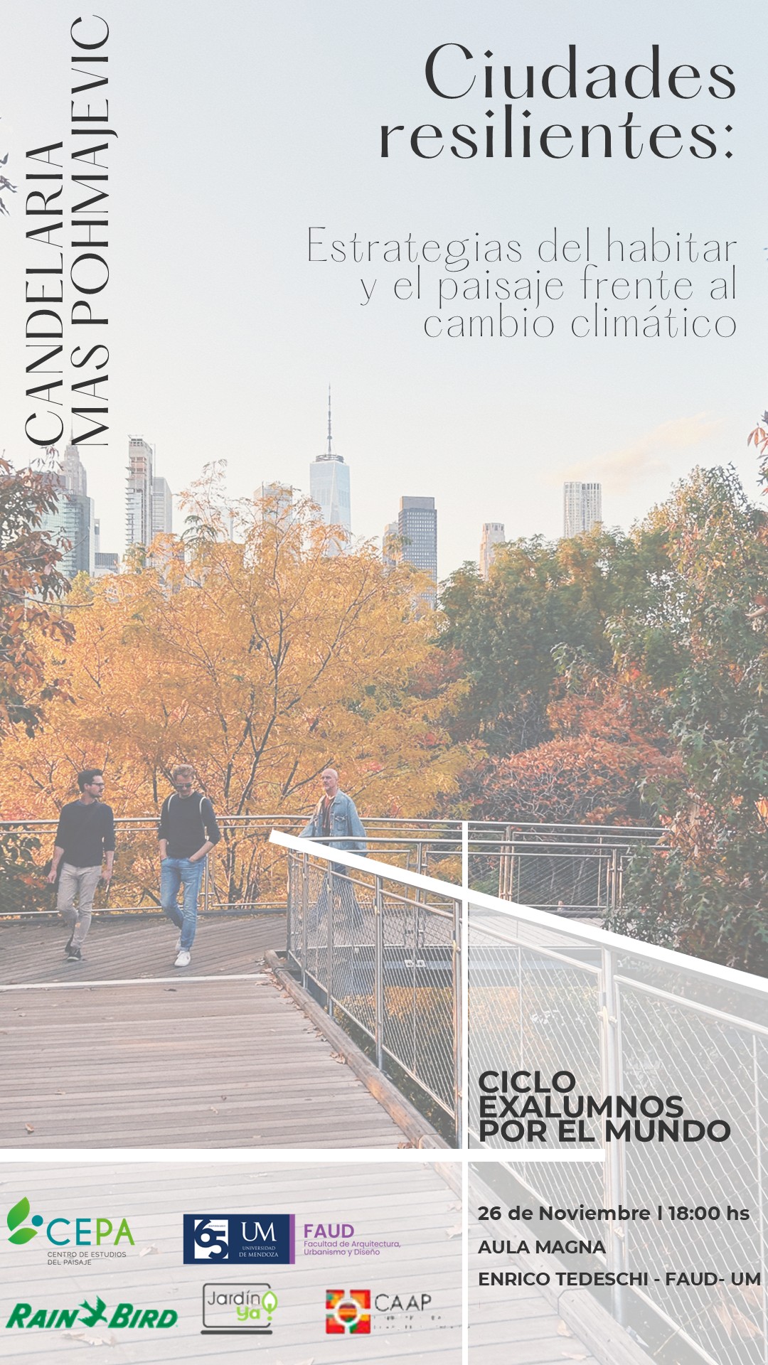 La Facultad de Arquitectura, Urbanismo y Diseño de la Universidad de Mendoza se honra en recibir a la Arq. Candelaria Mas Pohmajevic, exalumna UM y referente internacional en planificación urbana resiliente, quien brindará una conferencia abierta al público titulada “Ciudades resilientes: Estrategias del habitar y el paisaje frente al cambio climático”. El encuentro será el miércoles 26 de noviembre a las 18 h en el Aula Magna Enrico Tedeschi (FAUD UM), con modalidad presencial y virtual para participantes no locales.