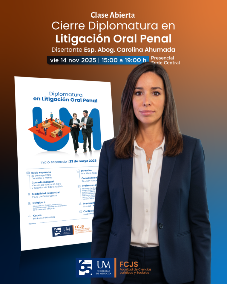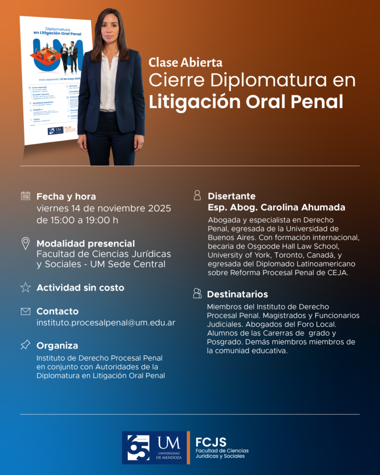 El próximo viernes 14 de noviembre de 2025, de 15:00 a 19:00 h, se realizará en la Sede Central de la Universidad de Mendoza una Clase Abierta que marcará el cierre académico de la Diplomatura en Litigación Oral Penal, organizada por el Instituto de Derecho Procesal Penal de la Facultad de Ciencias Jurídicas y Sociales.