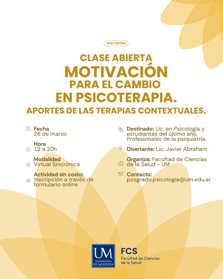 ¿Cómo se construye la motivación para cambiar en terapia? ¿Qué aportan los modelos contemporáneos de la psicoterapia a este proceso? Con el objetivo de dar respuesta a estos interrogantes, la Facultad de Ciencias de la Salud (FCS) de la Universidad de Mendoza (UM) invita a participar de la clase abierta: «Motivación para el cambio en psicoterapia. Aportes de las terapias contextuales».