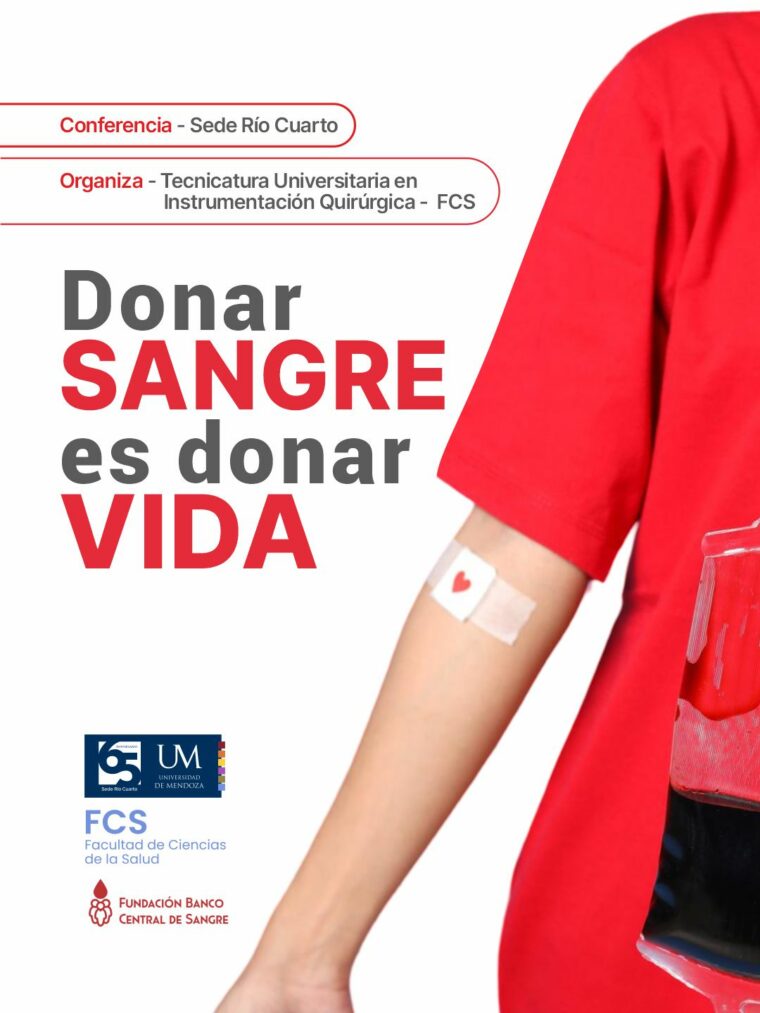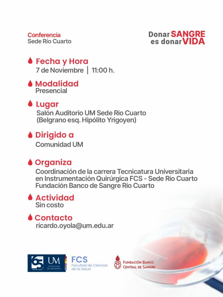 El próximo 7 de noviembre a las 11:00 hs, en el Salón Auditorio de la Universidad de Mendoza Sede Río Cuarto, se realizará la Conferencia “Donar sangre es donar vida”, una propuesta de sensibilización sobre la donación de sangre y médula ósea, destinada a estudiantes y profesionales del ámbito de la salud.
