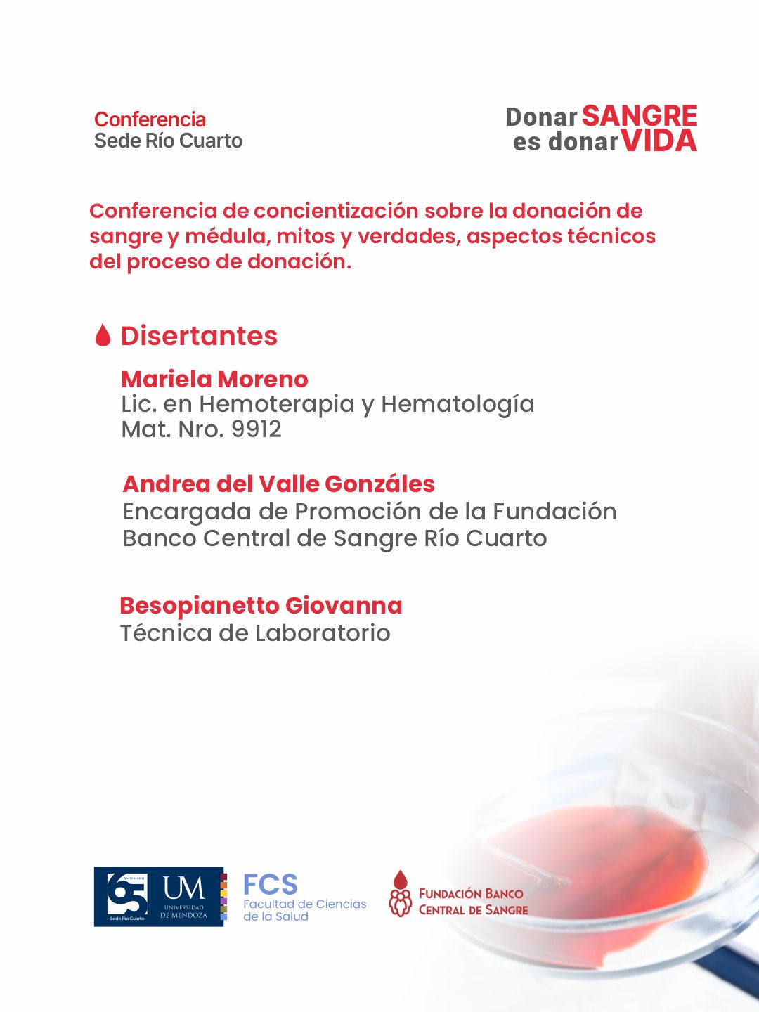 Las disertaciones estarán a cargo de Mariela Moreno, Licenciada en Hemoterapia y Hematología (Mat. 9912); Andrea del Valle Gonzales, encargada de Promoción de la Fundación Banco Central de Sangre Río Cuarto; y Giovanna Besopianetto, Técnica de Laboratorio.