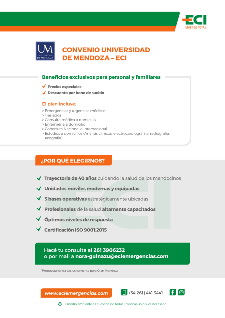 La Universidad de Mendoza (UM) continúa sumando beneficios para su comunidad. A través de un nuevo convenio con la empresa ECI Emergencias, el personal de la institución y sus familiares podrán acceder a un plan de salud integral con precios especiales y facilidades de pago.