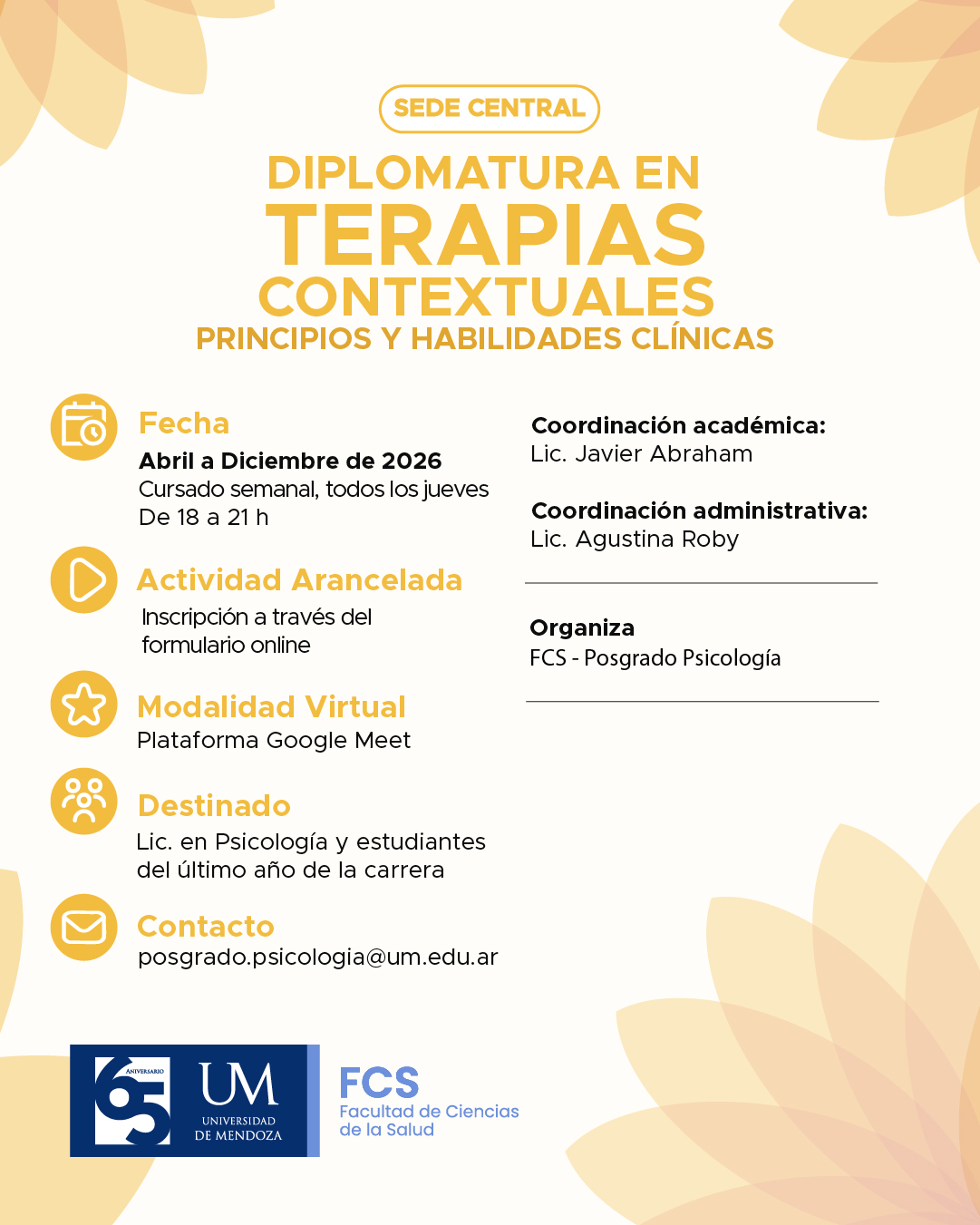 La Facultad de Ciencias de la Salud de la Universidad de Mendoza incorpora a su oferta académica la Diplomatura en Terapias Contextuales: principios y habilidades clínicas, una propuesta diseñada para brindar formación actualizada en los modelos terapéuticos de tercera ola y en el desarrollo de competencias clínicas basadas en evidencia.