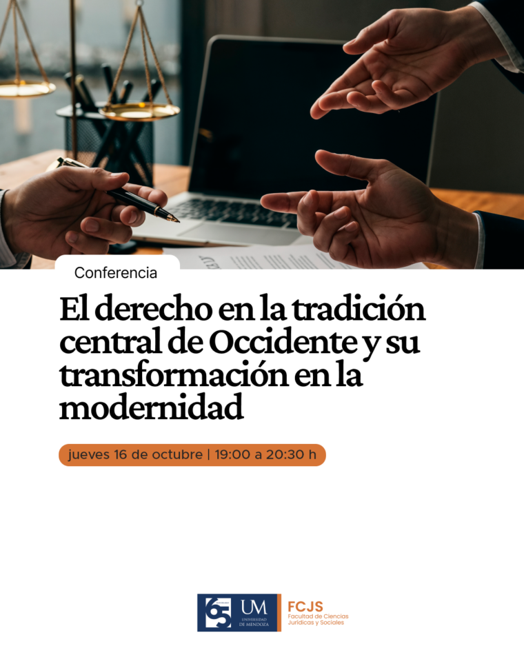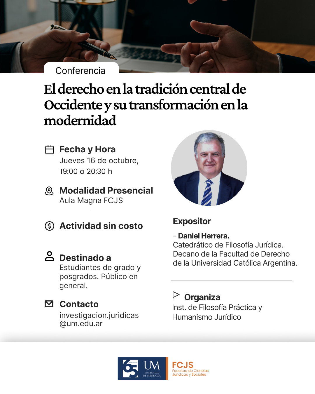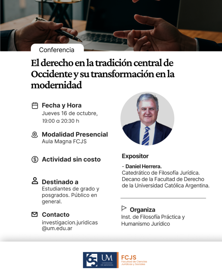 La Facultad de Ciencias Jurídicas y Sociales de la Universidad de Mendoza invita a participar de la conferencia “El derecho en la tradición central de Occidente y su transformación en la modernidad”, a cargo del Dr. Daniel Herrera, profesor de Filosofía del Derecho y actual decano de la Facultad de Derecho de la Universidad Católica Argentina.