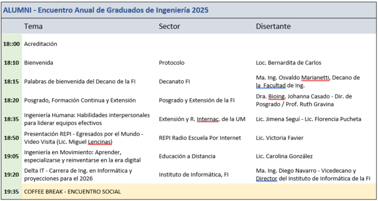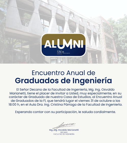 📅 El evento se realizará el martes 31 de octubre a las 18:00 h, en el Aula Dra. Ing. Cristina Párraga, ubicada en el nuevo edificio de la Facultad. La invitación está dirigida a todos los egresados, quienes podrán: