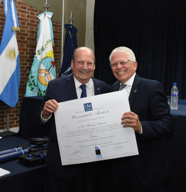 Como momento destacado de esta instancia, en atención a la voluntad expresada por su comunidad académica, se procedió a la entrega del diploma que acredita la reelección del Decano de la Facultad de Ciencias Médicas, Dr. Francisco Cutroni. La renovación de su mandato constituye un claro testimonio de la confianza en la continuidad de su proyecto académico y de desarrollo institucional.