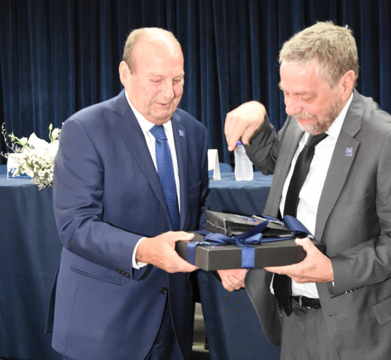 En reconocimiento a su destacada labor y compromiso con el fortalecimiento de la Universidad de Mendoza, el flamante Rector, Dr. Ing. Alfredo Iglesias, hizo entrega de un obsequio conmemorativo al Dr. Eduardo Luna. Tras cumplirse con el acto formal de traspaso de mando y la firma del acta correspondiente, el Dr. Luna también entregó un presente al nuevo Rector.