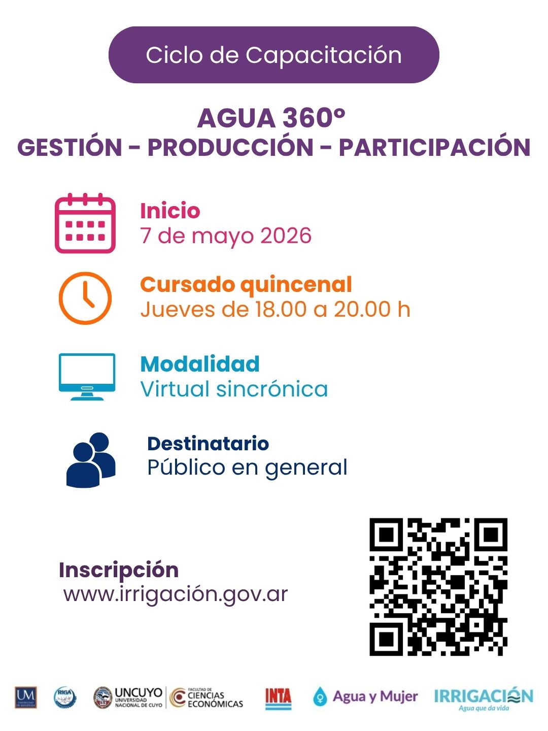 En un contexto de cambio climático y desafíos crecientes en la administración de recursos naturales, el Departamento General de Irrigación junto a la Universidad de Mendoza, la Universidad Nacional de Cuyo, el INTA y el RIGA organizan AGUA 360º: GESTIÓN – PRODUCCIÓN – Y PARTICIPACIÓN.