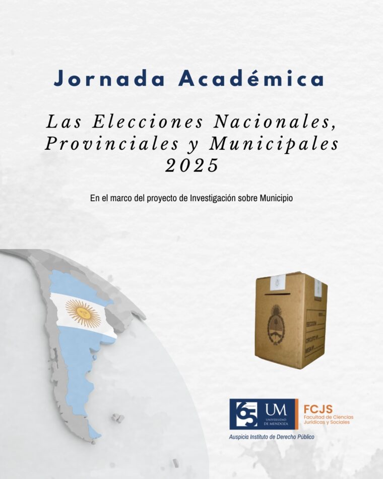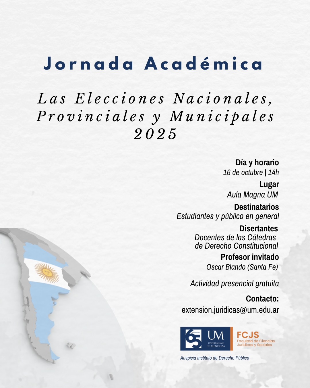 Las Cátedras de Derecho Constitucional y la Coordinación de Extensión y Vinculación de la Facultad de Ciencias Jurídicas y Sociales (UM) invitan a la comunidad a la Jornada Académica sobre “Las Elecciones Nacionales, Provinciales y Municipales 2025”. La actividad se realizará en forma presencial el jueves 16 de octubre a las 14:00h, en el Aula Magna de la Universidad de Mendoza.