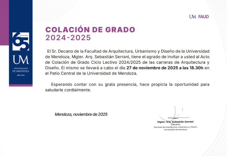 La Facultad de Arquitectura, Urbanismo y Diseño invita a acompañar a sus egresados en el Acto de Colación de Grado, que se realizará el jueves 27 de noviembre a las 18:30 h en el Patio Central de la Universidad de Mendoza.