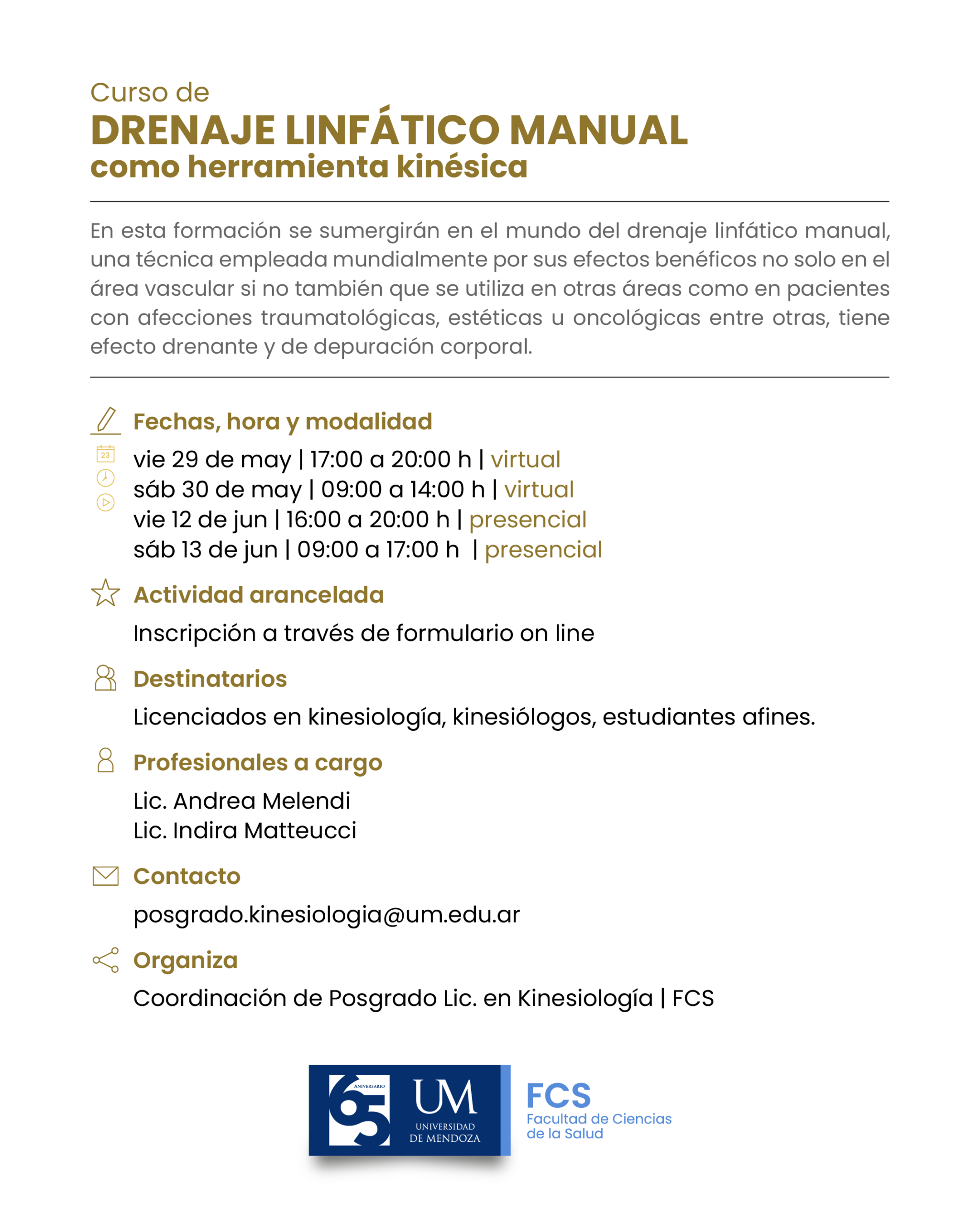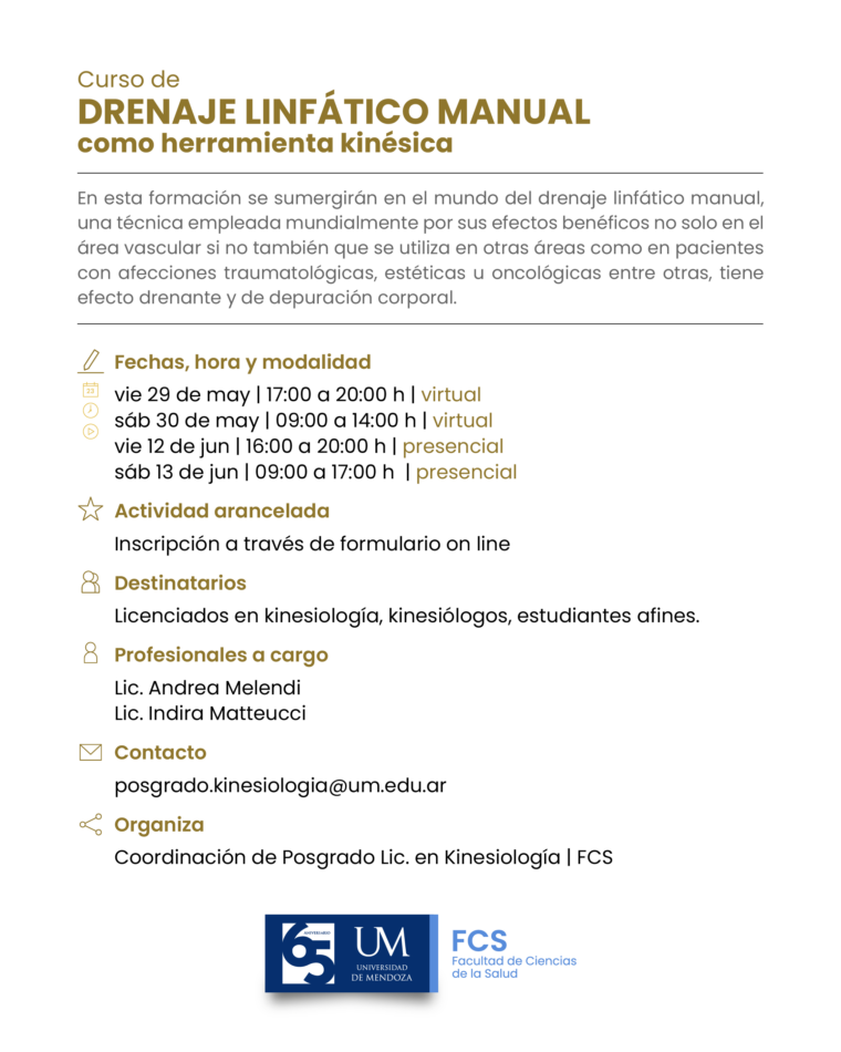 La Universidad de Mendoza, a través de la Coordinación de Posgrado de la Licenciatura en Kinesiología de la Facultad de Ciencias de la Salud (FCS), abre las inscripciones para el «Curso de Drenaje Linfático Manual como herramienta kinésica».