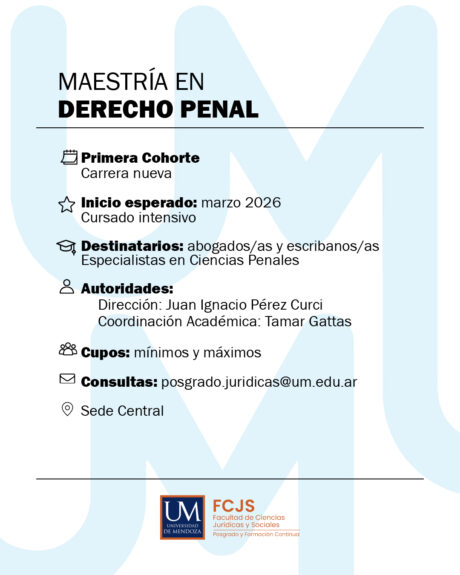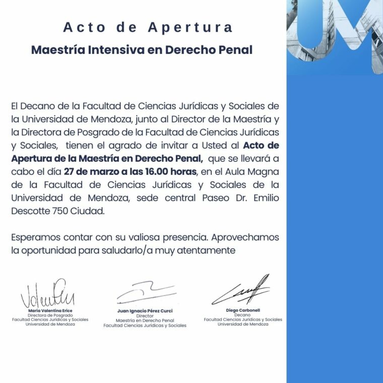 La Facultad de Ciencias Jurídicas y Sociales de la Universidad de Mendoza (UM) tiene el agrado de invitar a la comunidad académica y a profesionales del derecho al Acto de Apertura de la Maestría en Derecho Penal, evento que marcará el inicio formal de una nueva cohorte de esta destacada carrera de posgrado.