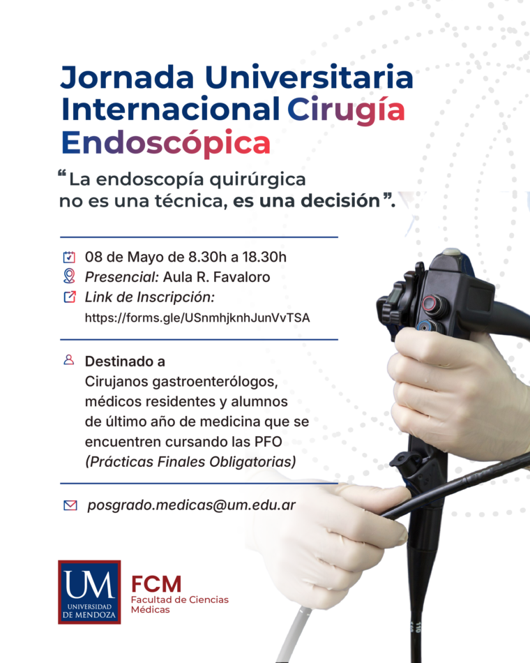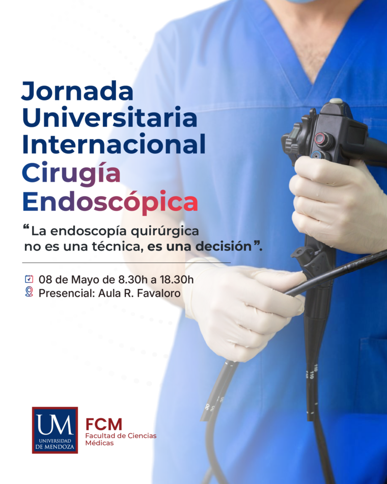 La Facultad de Ciencias Médicas (FCM) de la Universidad de Mendoza (UM) invita a la comunidad médica y académica a participar de la Jornada Universitaria Internacional de Cirugía Endoscópica. Este importante encuentro de actualización profesional tiene como premisa central una fuerte declaración: «La endoscopía quirúrgica no es una técnica, es una decisión».