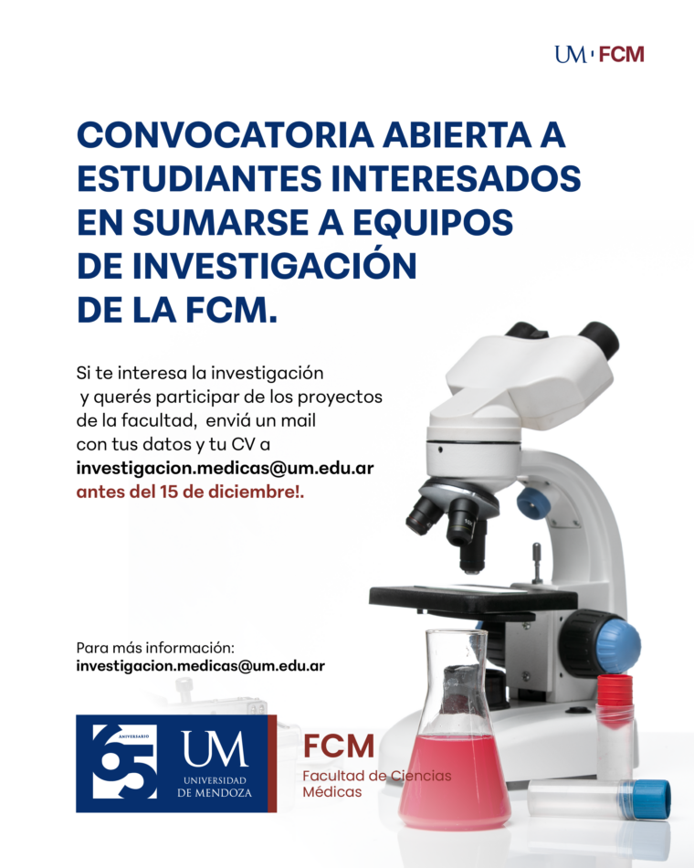 La Facultad de Ciencias Médicas de la Universidad de Mendoza abrió una convocatoria dirigida a estudiantes de la carrera de Medicina que deseen formar parte de equipos de investigación activos en la institución.