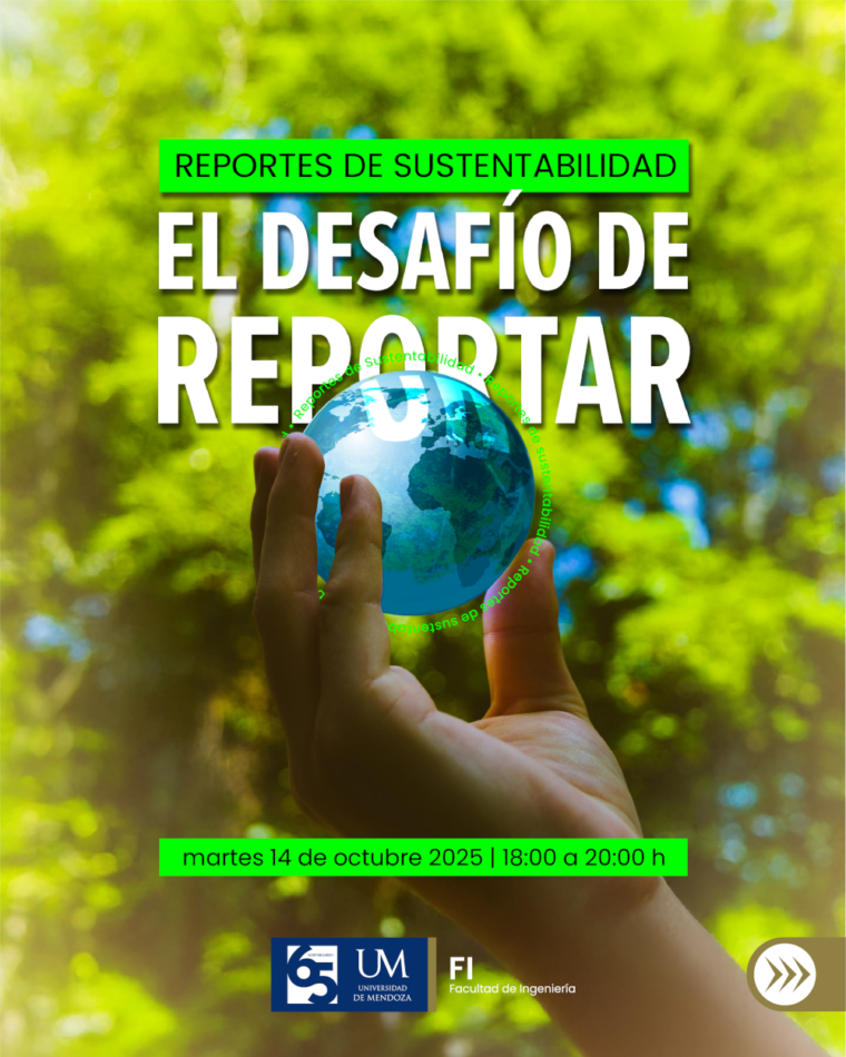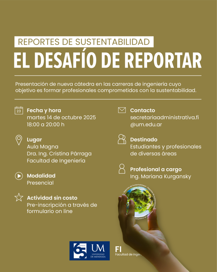 El martes 14 de octubre de 2025, de 18 a 20 h, se llevará a cabo en el Aula Magna Dra. Ing. Cristina Párraga de la Facultad de Ingeniería UM la presentación del curso “Reportes de Sustentabilidad: El desafío de reportar”. La actividad será presencial, gratuita y con inscripción previa, y está dirigida a estudiantes y profesionales de diversas disciplinas.