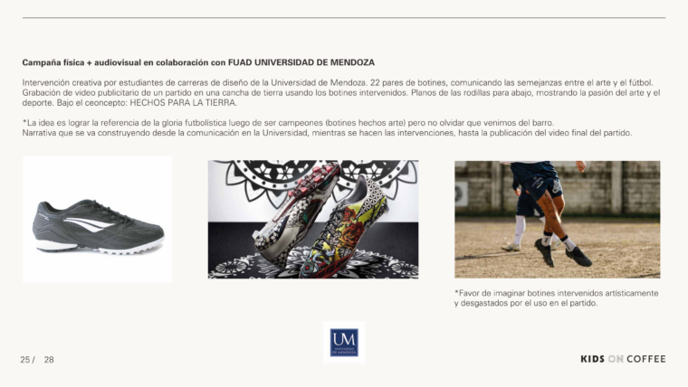 La intervención consistió en la creación de 20 pares de botines, los cuales van ser transformados en piezas de arte por estudiantes de las carreras de diseño de nuestra Universidad. El objetivo fue comunicar las semejanzas estéticas y pasionales entre el proceso creativo y el fútbol que nace en el potrero.