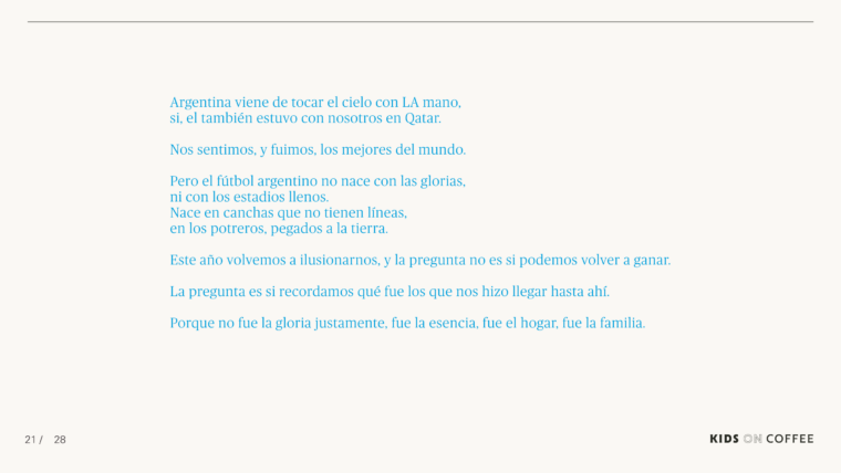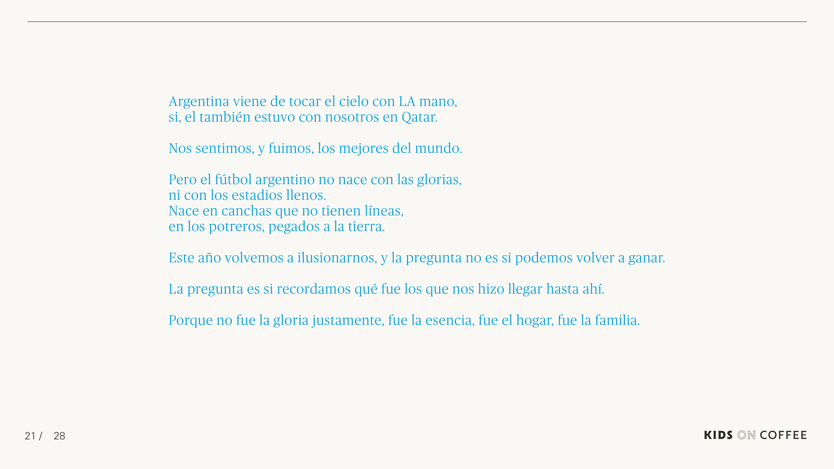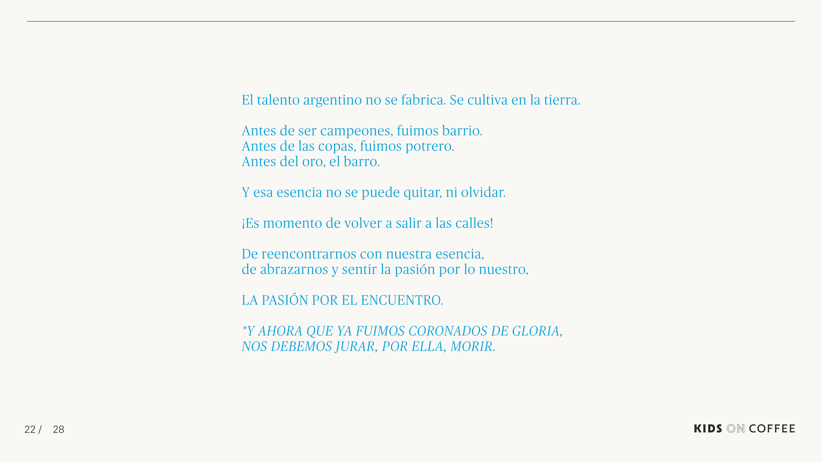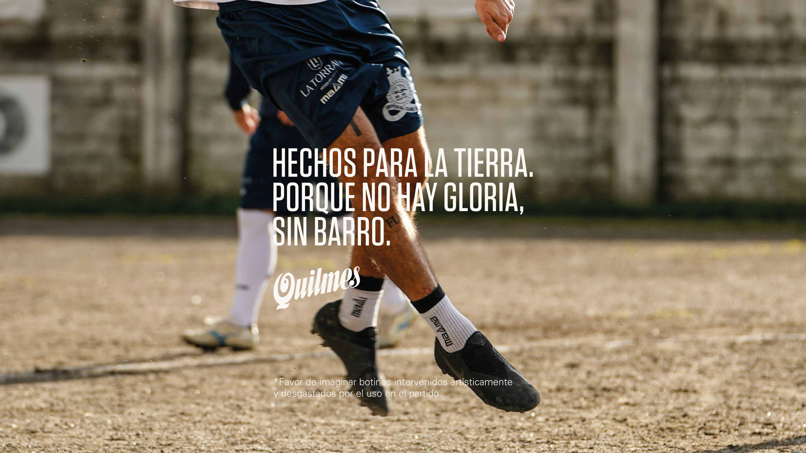 La narrativa de la campaña, denominada «Hechos para la Tierra», busca recordar que antes de las copas y el oro, estuvo el barro y la esencia del barrio. Los botines que se intervendrán seran utilizados en la grabación de un video publicitario de un partido disputado en una cancha de tierra, mostrando el desgaste real del juego sobre la obra artística.