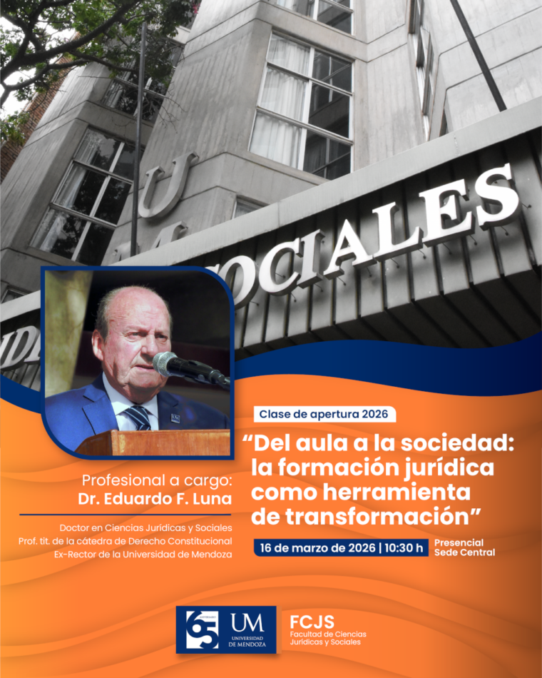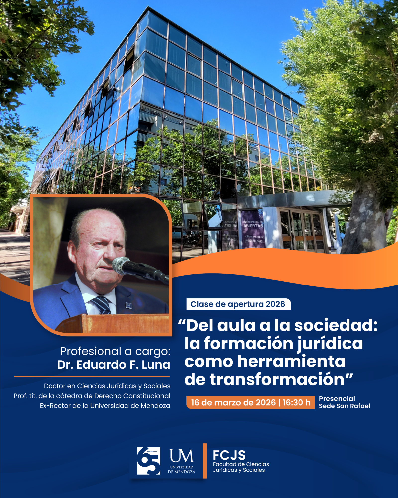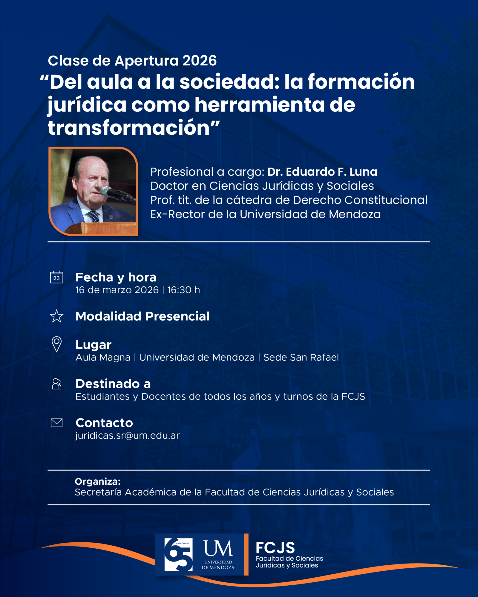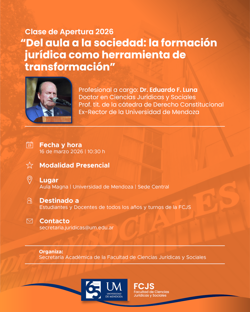 Con un profundo compromiso hacia la excelencia académica, anunciamos la Clase de Apertura 2026 de la Facultad de Ciencias Jurídicas y Sociales (FCJS) de la Universidad de Mendoza. El evento, con el que la Facultad inaugurará oficialmente su año académico, contará con una conferencia central a cargo del Dr. Eduardo F. Luna, Doctor en Ciencias Jurídicas y Sociales, Profesor titular de la cátedra de Derecho Constitucional y Ex-Rector de nuestra Casa de Estudios.
