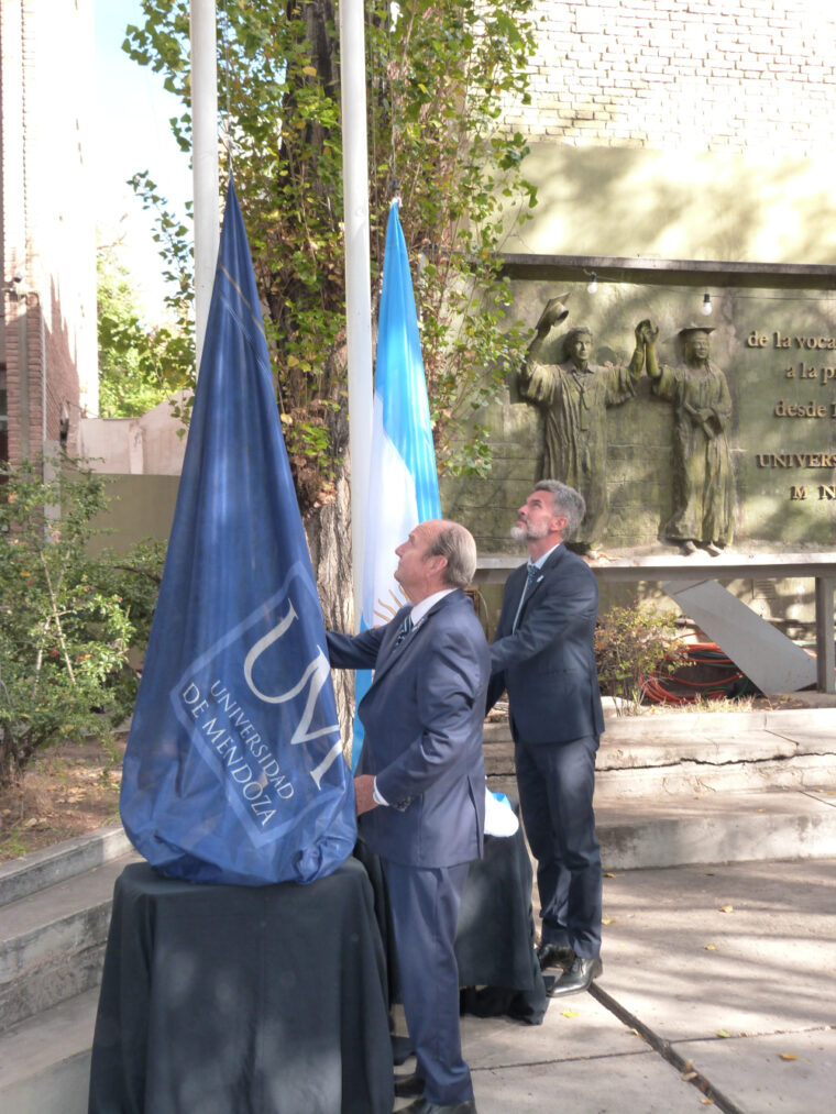 Para continuar con este acto conmemorativo, se invitó al Señor Rector de la Universidad de Mendoza, Dr. Eduardo Luna, junto al Sr. Intendente de la Ciudad de Mendoza, Dr. Ulpiano Suarez, a acercarse al mástil para llevar a cabo el izado de la Bandera Nacional, como así también de la Bandera de la Universidad de Mendoza, símbolo de nuestra identidad y de los valores que promovemos en esta Casa de Altos Estudios.