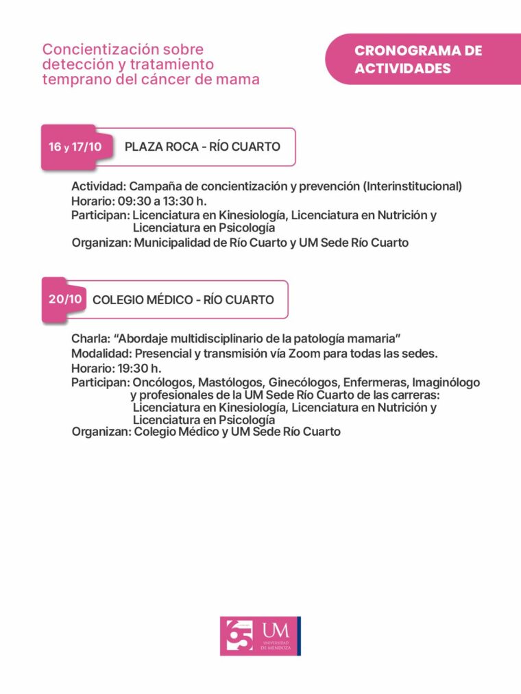 📅 Consultá el cronograma completo de actividades y sumate a las iniciativas que durante todo el mes de octubre invitan a vestirse de rosa por la prevención y la vida.