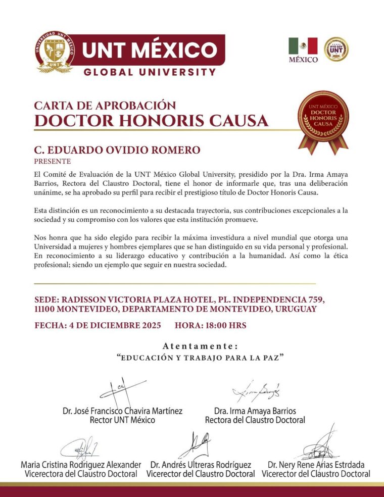 La Universidad de Mendoza (UM), junto con la Facultad de Arquitectura, Urbanismo y Diseño (FAUD), felicita al Dr. Eduardo Ovidio Romero, Profesor Titular Regular y actual Coordinador de Posgrado de la FAUD-UM Sede Río Cuarto, quien será distinguido con el título de Doctor Honoris Causa por la UNT México Global University.