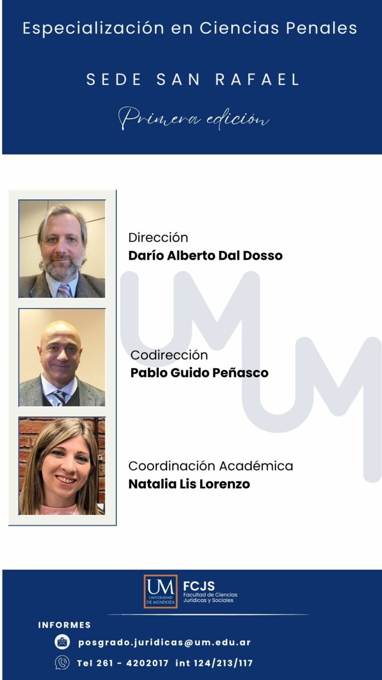 Informes y consultas Para obtener mayor información sobre la Especialización en Ciencias Penales, los interesados pueden ponerse en contacto con la Dirección de Posgrado a través del correo electrónico posgrado.juridicas@um.edu.ar o comunicándose por teléfono al 261 – 4202017 (internos 124 / 213 / 117).