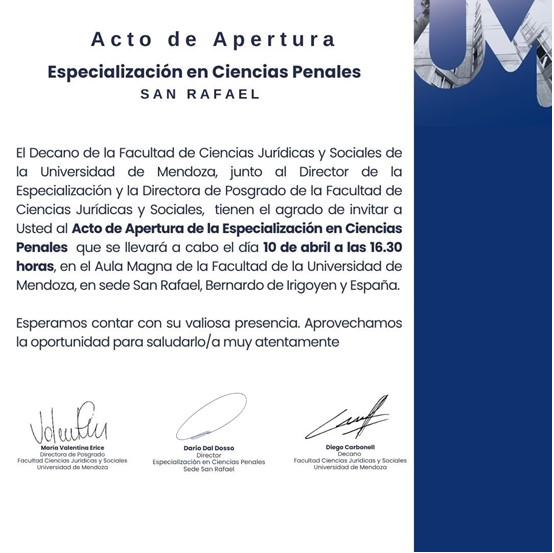 El Decano de la Facultad de Ciencias Jurídicas y Sociales de la Universidad de Mendoza (UM), Dr. Diego Carbonell, junto a las autoridades de posgrado, invitan a la comunidad académica y profesionales del derecho al Acto de Apertura de la primera cohorte de la Especialización en Ciencias Penales en la Sede San Rafael.