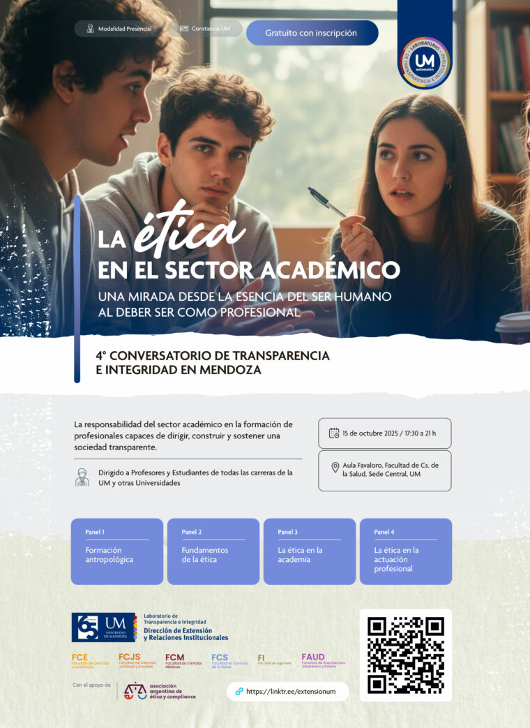 La Universidad de Mendoza (UM), a través de su Laboratorio de Transparencia e Integridad (LabTIUM), anuncia la realización de la cuarta edición de su Conversatorio, un espacio de reflexión entre sectores, que se ha consolidado como referencia en la promoción de valores éticos. Tras enfocarse en ediciones anteriores en la ética de los sectores público y privado, la mirada de este año se dirige hacia el corazón de la formación universitaria: «La ética en el sector académico: una mirada desde la esencia del ser humano al deber ser como profesional».