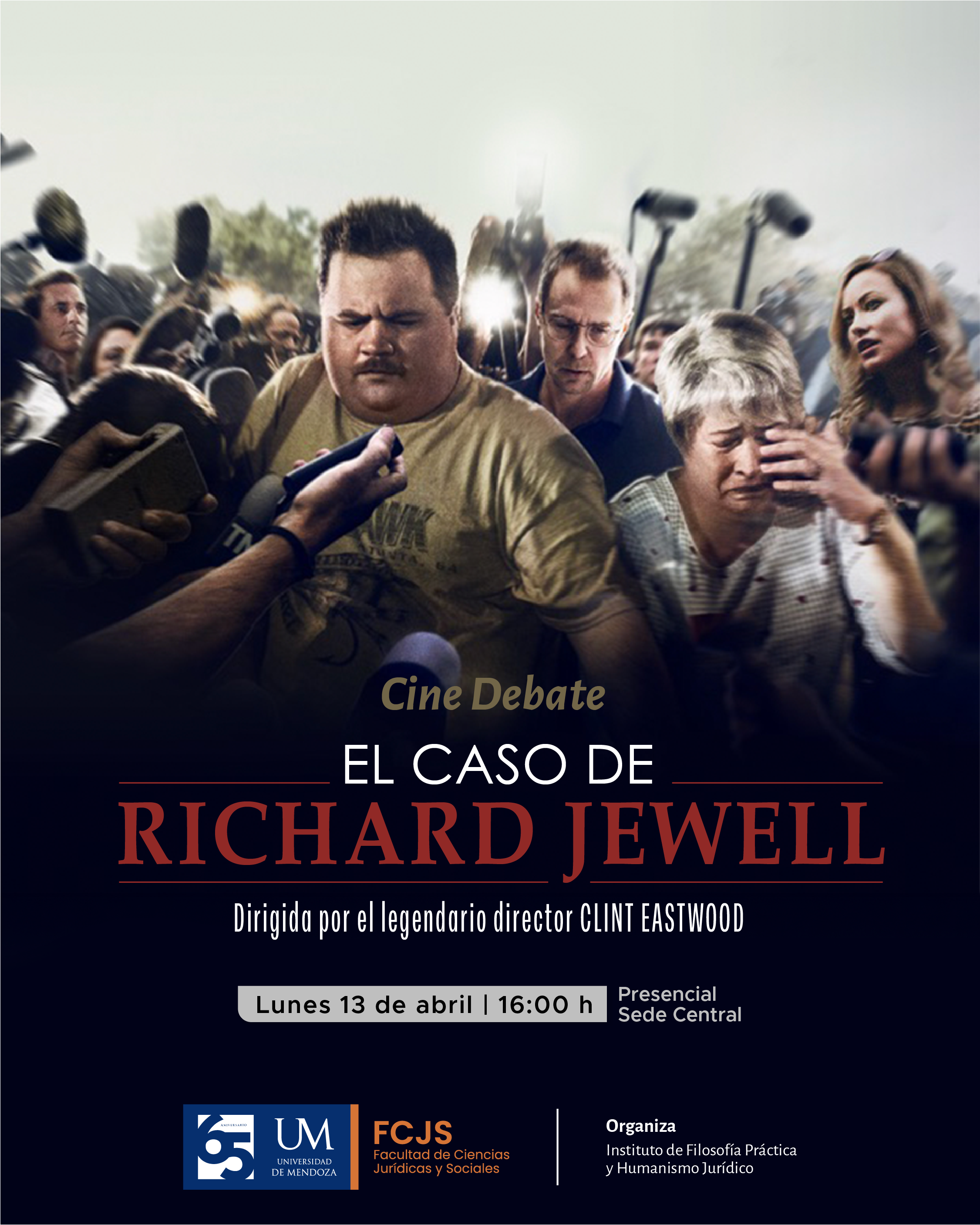 En esta oportunidad, se proyectará la película «El caso de Richard Jewell», obra dirigida por el legendario cineasta Clint Eastwood. La propuesta busca invitar a los asistentes a disfrutar de la función y, posteriormente, analizar y discutir las temáticas del film junto a los demás participantes en un ambiente de diálogo y enriquecimiento académico.