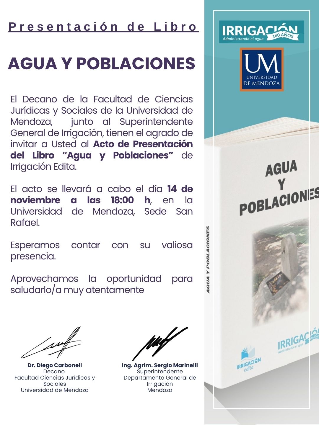 En el marco del ciclo “Irrigación 140 años”, la Facultad de Ciencias Jurídicas y Sociales de la Universidad de Mendoza y el Instituto de Filosofía Práctica y Humanismo Jurídico organizan un encuentro presencial para presentar el libro Agua y Poblaciones, editado por Irrigación.