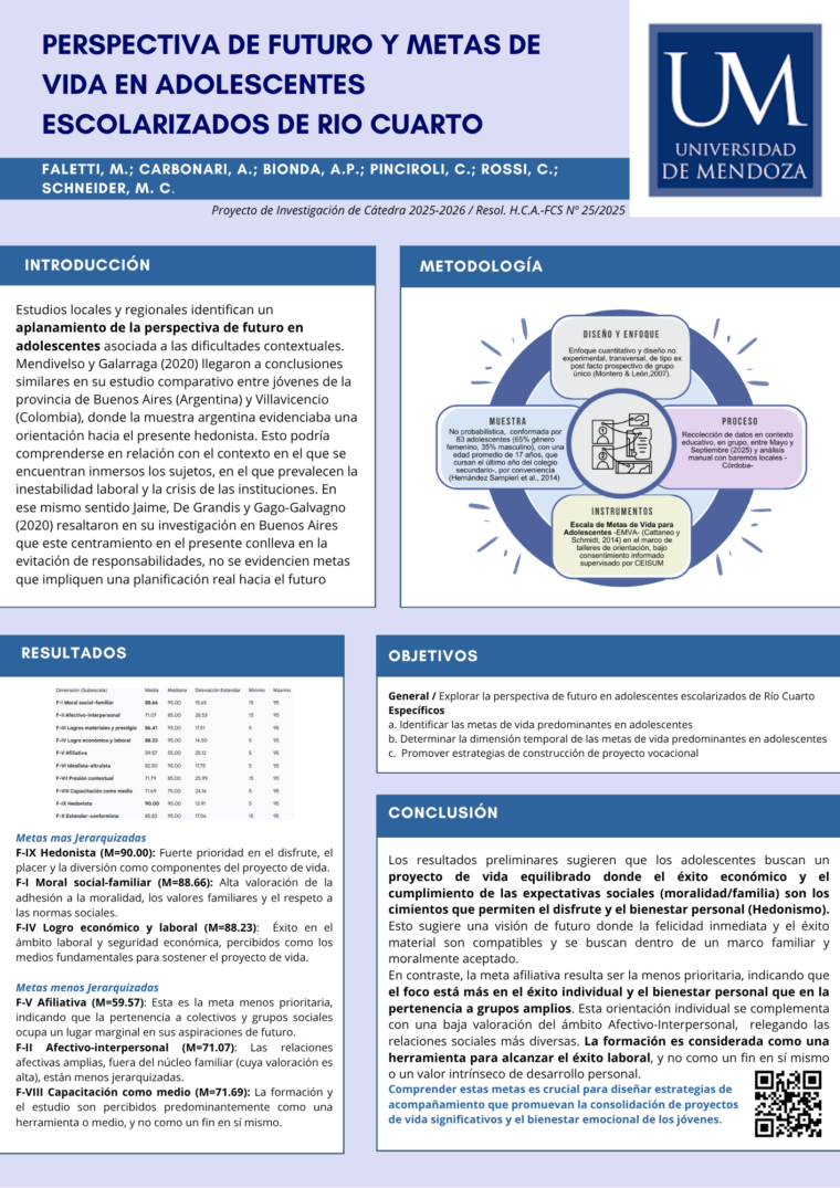 - “Perspectiva de futuro y metas de vida en adolescentes escolarizados de Río Cuarto” (Resol. 25/2026 FCS-UM). Exposición a cargo de las Lic. Agostina Carbonari, Ana Paula Bionda y Clara Schneider.