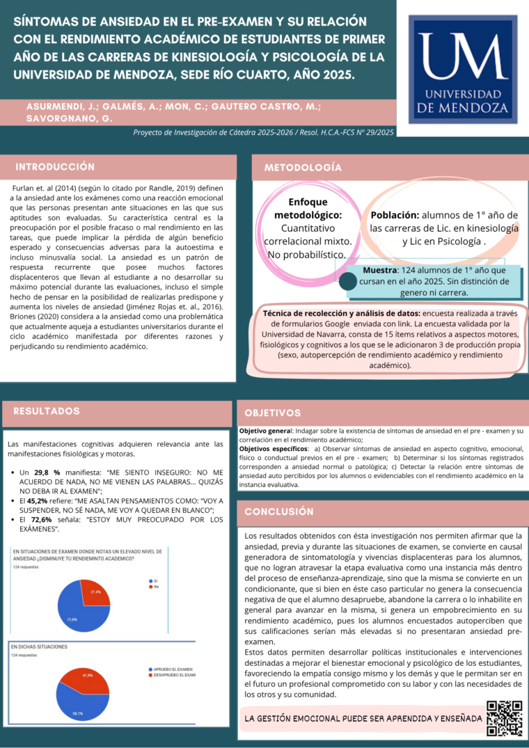 - “Síntomas de ansiedad en el pre-examen y su relación con el rendimiento académico en estudiantes de Kinesiología de la Universidad de Mendoza” (Resol. 29/2025 FCS-UM). Exposición a cargo de Julia Asurmendi y Ana Galmés.