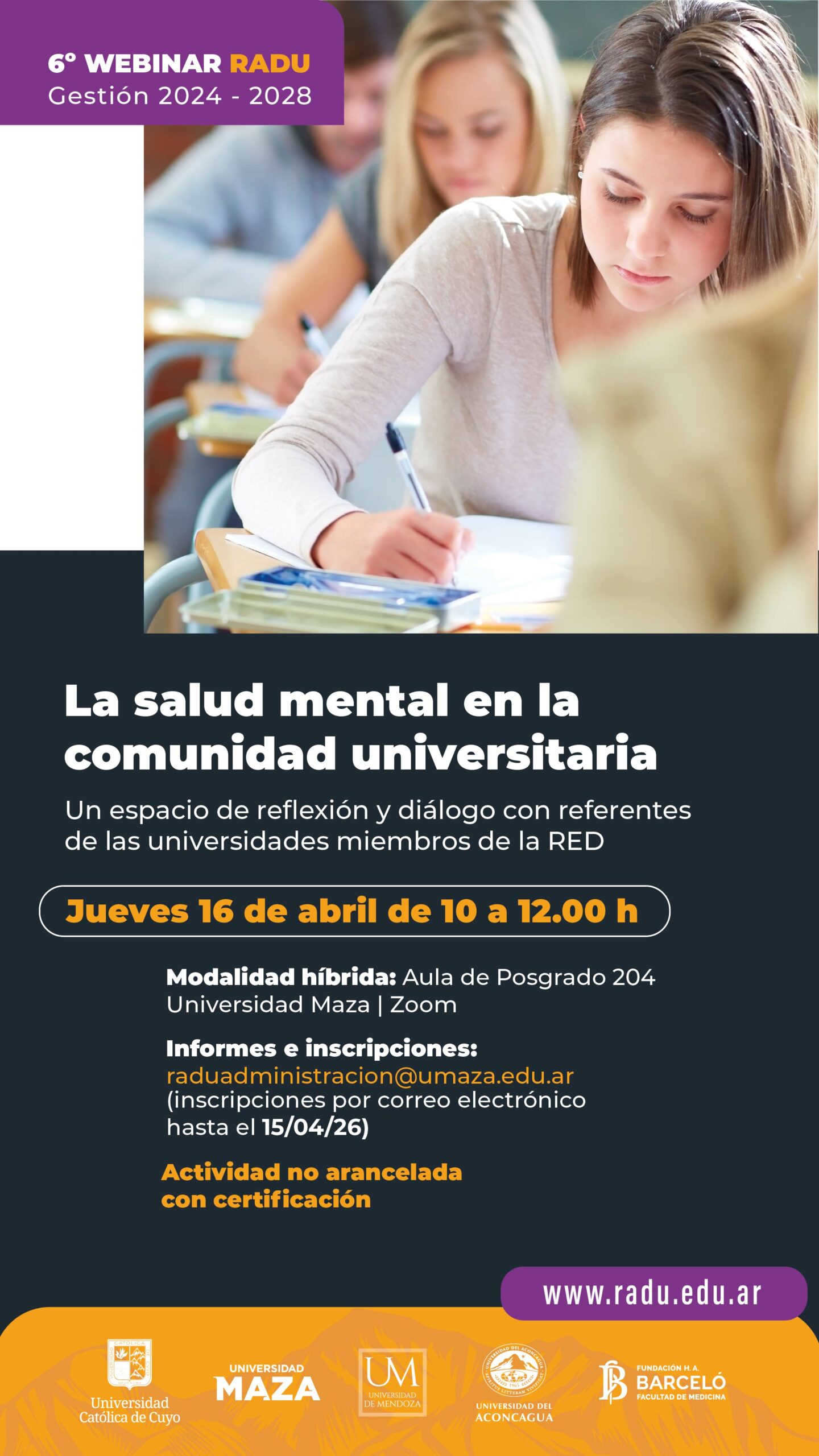 La Red Andina de Universidades (RADU) invita a estudiantes, docentes y al público en general a participar de su 6° Webinar, el cual abordará un tema de gran relevancia y actualidad: «La salud mental en la comunidad universitaria». Este evento se enmarca dentro del plan de gestión 2024-2028 de la institución.