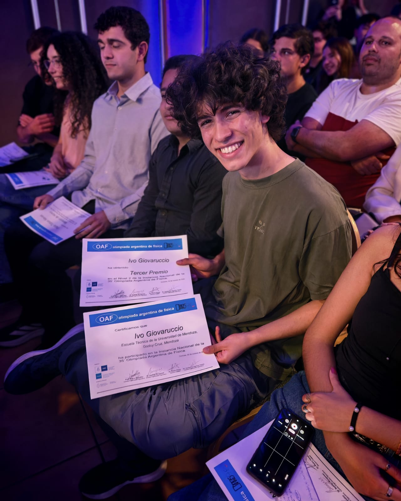 Felicitamos a Ivo Giovarruscio, estudiante de 4° año de la modalidad Informática de la Escuela Técnica de la Universidad de Mendoza, quien obtuvo el Tercer Premio en el Nivel 2 de la Instancia Nacional de la 35ª Olimpiada Argentina de Física (OAF), realizada en Córdoba durante octubre de 2025.