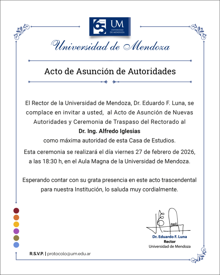 El actual Rector, Dr. Eduardo F. Luna, ha extendido la invitación a la comunidad académica y al público general para presenciar el momento en que el Dr. Ing. Alfredo Iglesias tome posesión del cargo como máxima autoridad de esta Casa de Estudios.