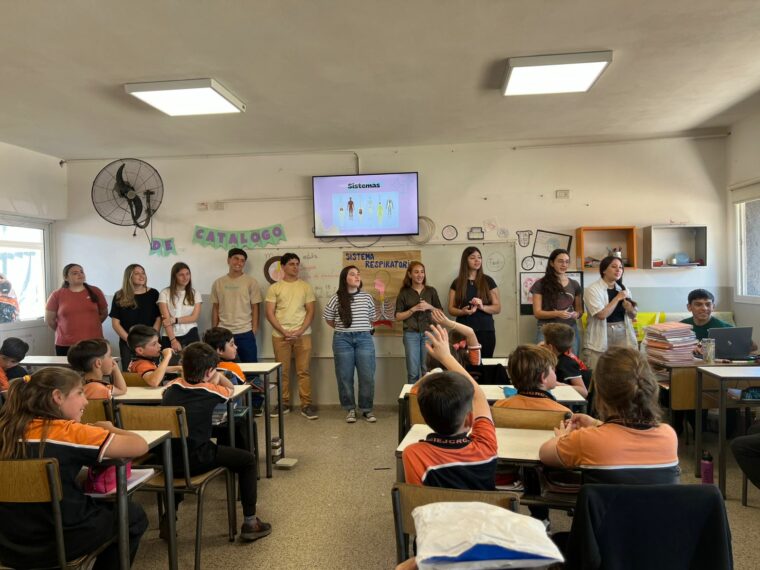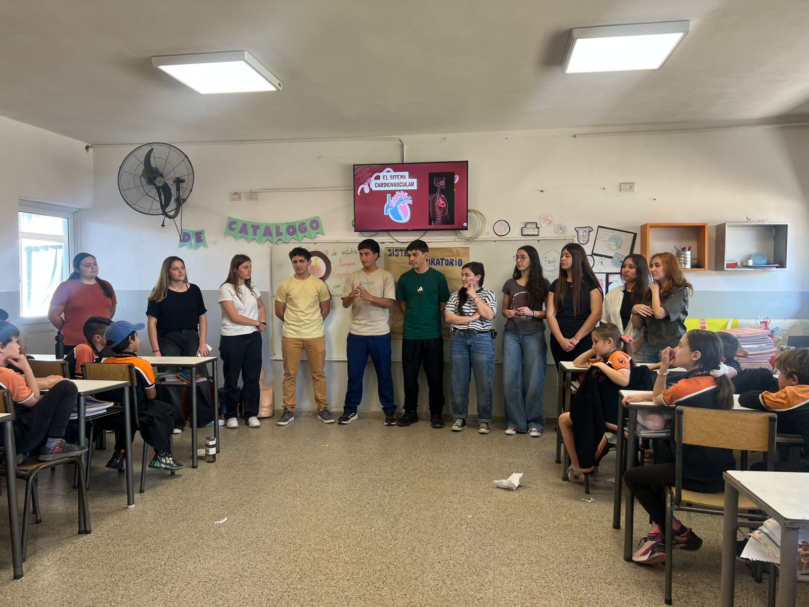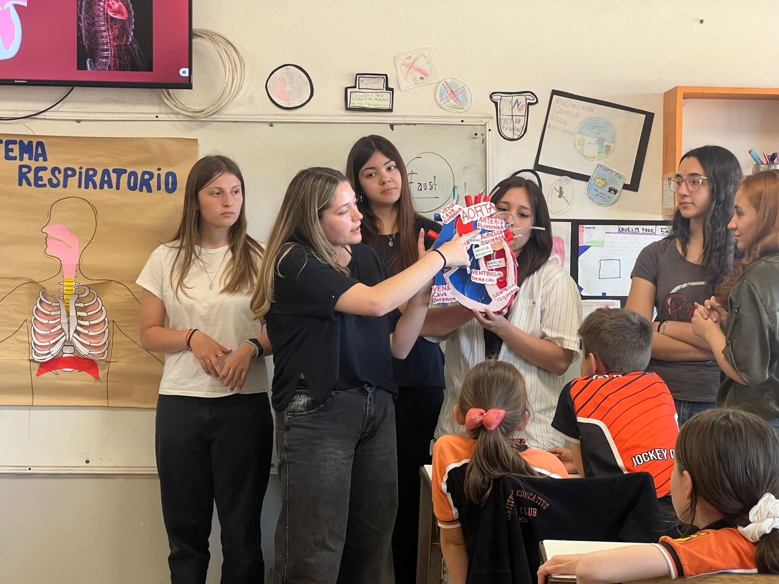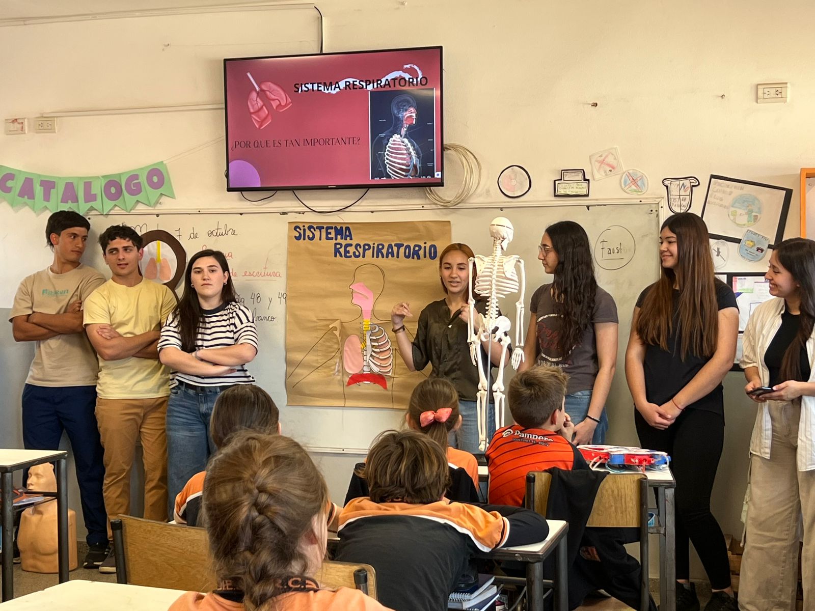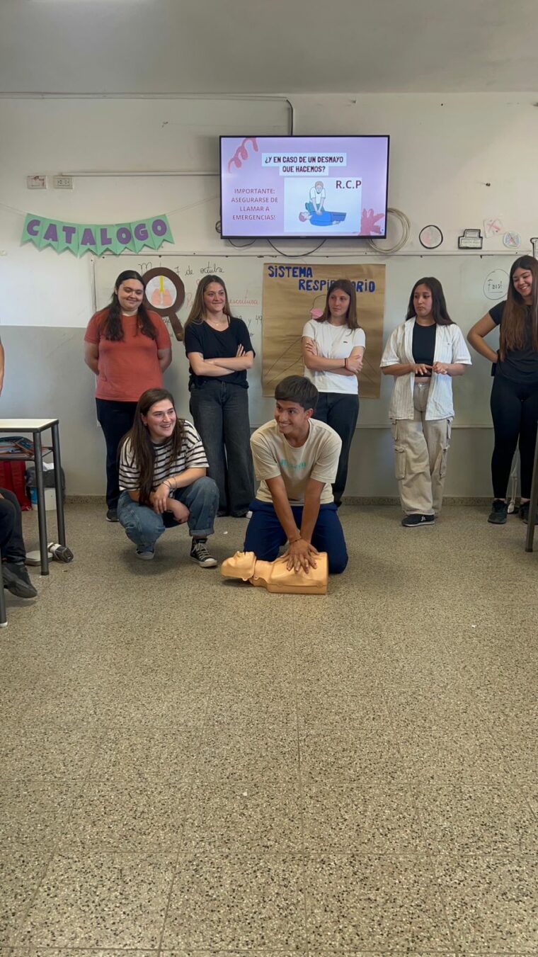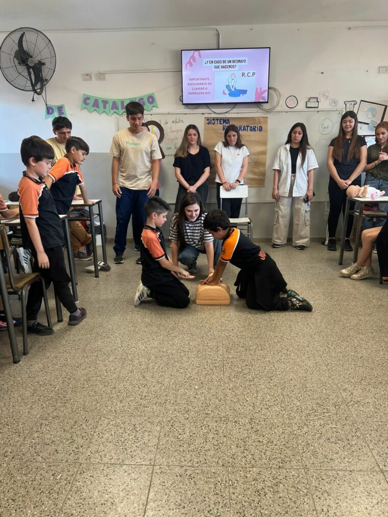 Los estudiantes prepararon y dictaron una charla destinada a niños de 3° grado, transmitiendo de forma clara y didáctica conceptos fundamentales sobre cómo actuar ante emergencias y cómo realizar maniobras básicas de reanimación cardiopulmonar (RCP).