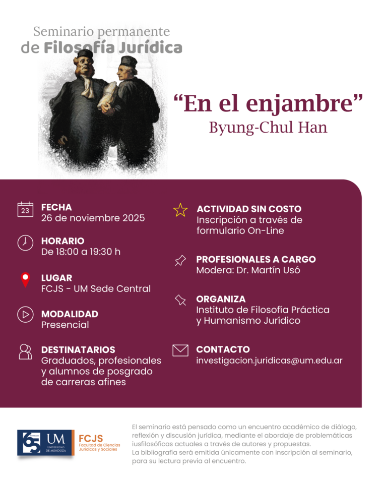 El Departamento de Filosofía Práctica e Humanismo Jurídico de la Facultad de Ciencias Jurídicas y Sociales de la Universidad de Mendoza invita a participar del Seminario permanente de Filosofía Jurídica, que se desarrollará el martes 26 de noviembre de 18:00 a 19:30 h en la sede central de la UM.