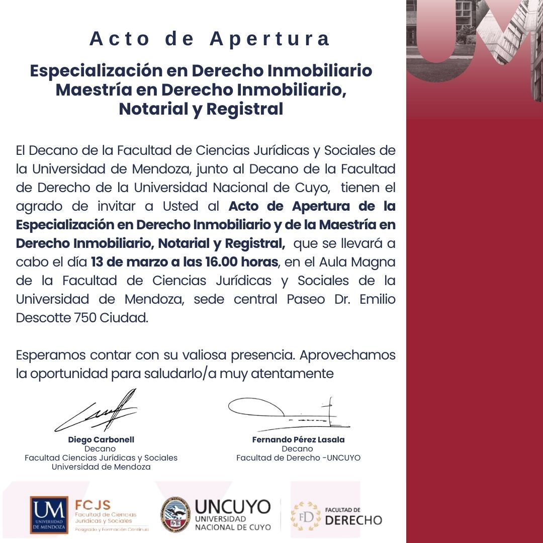 En un esfuerzo conjunto por promover la excelencia académica y la actualización profesional, el Decano de la Facultad de Ciencias Jurídicas y Sociales de la Universidad de Mendoza, Dr. Diego Carbonell, y el Decano de la Facultad de Derecho de la Universidad Nacional de Cuyo, Dr. Fernando Pérez Lasala, anunciaron el Acto de Apertura de la Especialización en Derecho Inmobiliario y de la Maestría en Derecho Inmobiliario, Notarial y Registral.