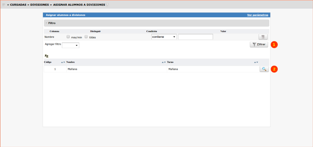 En la Pantalla Inicial se podrá visualizar el listado de Divisiones registradas en el sistema. Dicho listado podrá ser filtrado por los campos Nombre y Turno haciendo clic en el botón Filtrar (1) tal como se muestra a continuación: