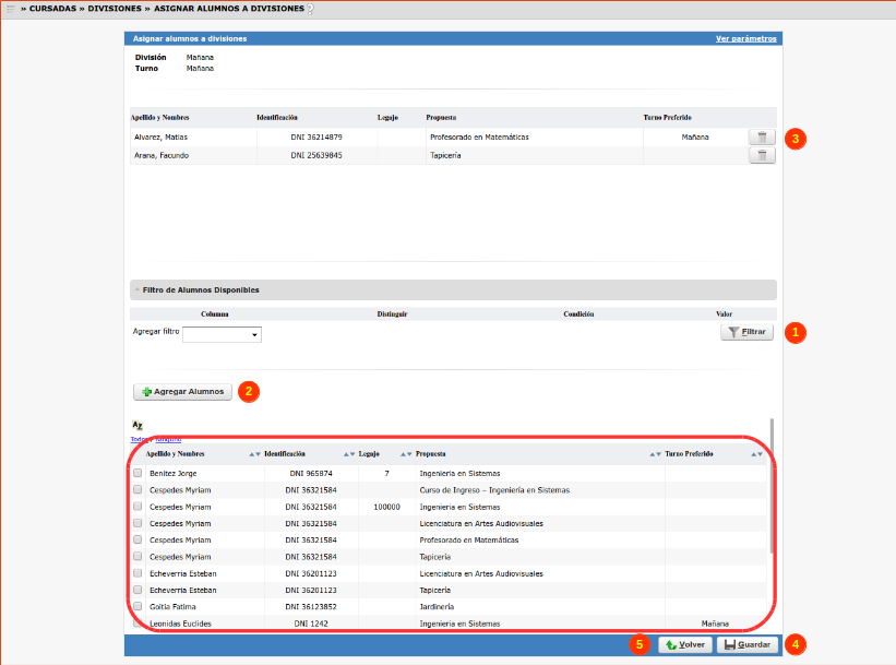 Una vez asociado los Alumnos, se deberá hacer clic en el botón Guardar (4) para confirmar los datos. Haciendo clic en el botón Volver (5) se volverá a la Pantalla Inicial.