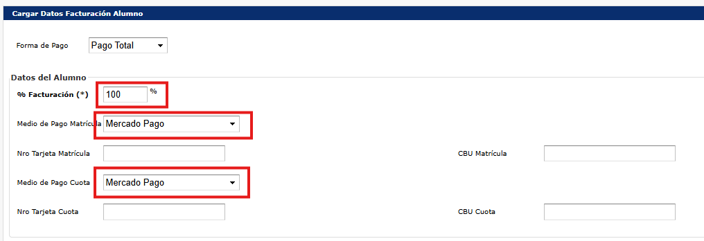 - Medio de Pago Cuota: Dejar por defecto Mercado Pago salvo que el alumno especifique otra opción.